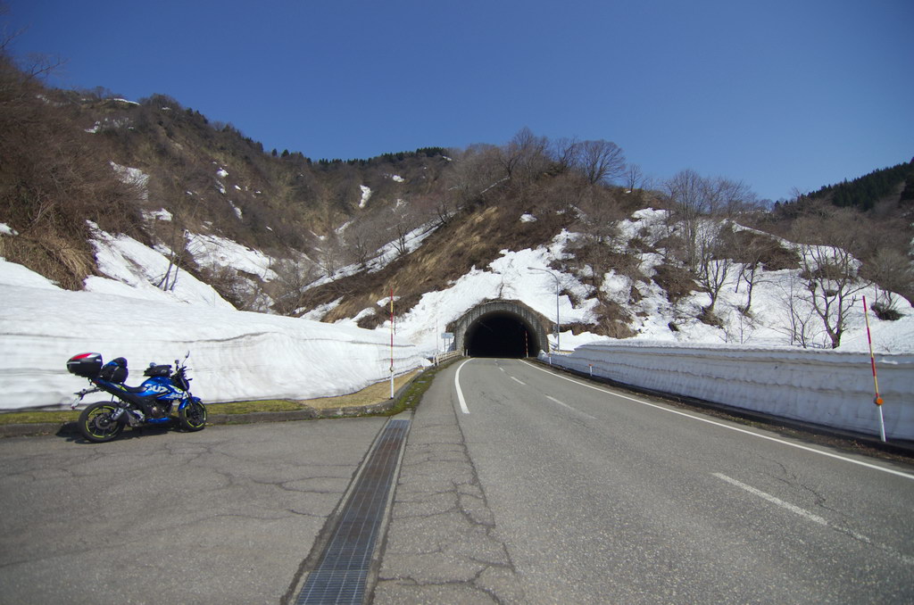 2024-2025冬は特に積雪量が多くなりました。4月5日時点で津南アメダスの積雪量が205cmも!。しかし標高200〜500m程度なので信州よりは暖かく、暖かい日の昼間なら安心して走れます(夜間は凍結)。1泊2日で新潟ツーリングに出かけてみることにしました。 県境を越えて妙高高原に入ると大雪原が広がりました。長野県側の信濃町の雪は僅かだったのですが、県境を超えると急に雪が増えます。 日本海側に出ました。ちょっと時雨気味。 青海川オートキャンプ場で一泊しました。 すぐ近くに海沿い駅として有名な青海川駅があります。 お馴染みR353小岩トンネル。柏崎と信州を結ぶルートならやっぱりこの道が一番です。狭路区間を県道275に迂回すればフル2車線で柏崎から津南まで快走可能。