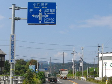 若狭に来たら是非とも三方五湖レインボーラインを走りたいところですが・・・ 通行料金が非常にお高いので今回はパス。昔走った記憶によれば湖と海を見下ろす絶景パノラマ山岳道路です。皆さんには是非お薦め。(ていうかやっぱり若狭湾はレインボーラインとエンゼルラインに尽きると思う。) |